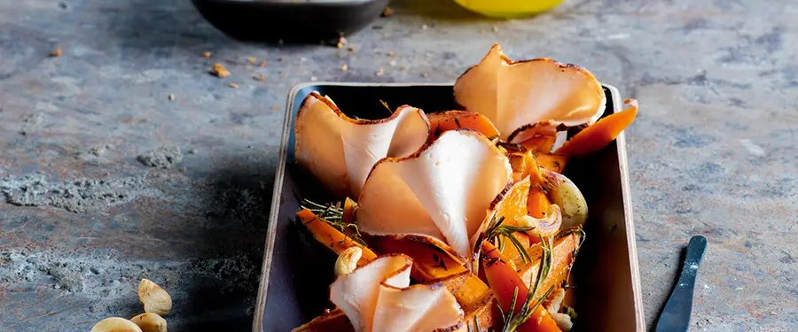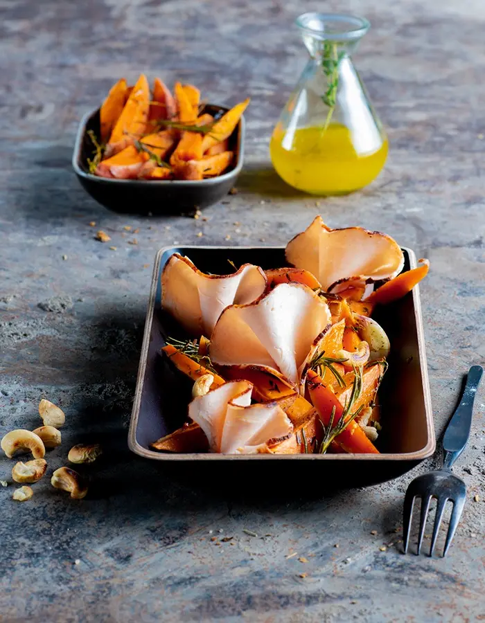 Verdeel de bataat frietjes en de cashewnootjes over de borden, dresseer er de plakjes kip aan ’t spit bij.