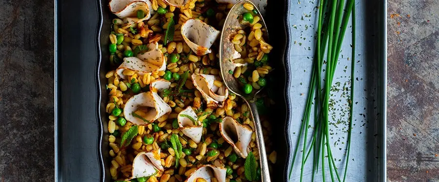 Meng de koude blé met de vinaigrette, de erwtjes en de fijngesnipperde kruiden (munt en bieslook).