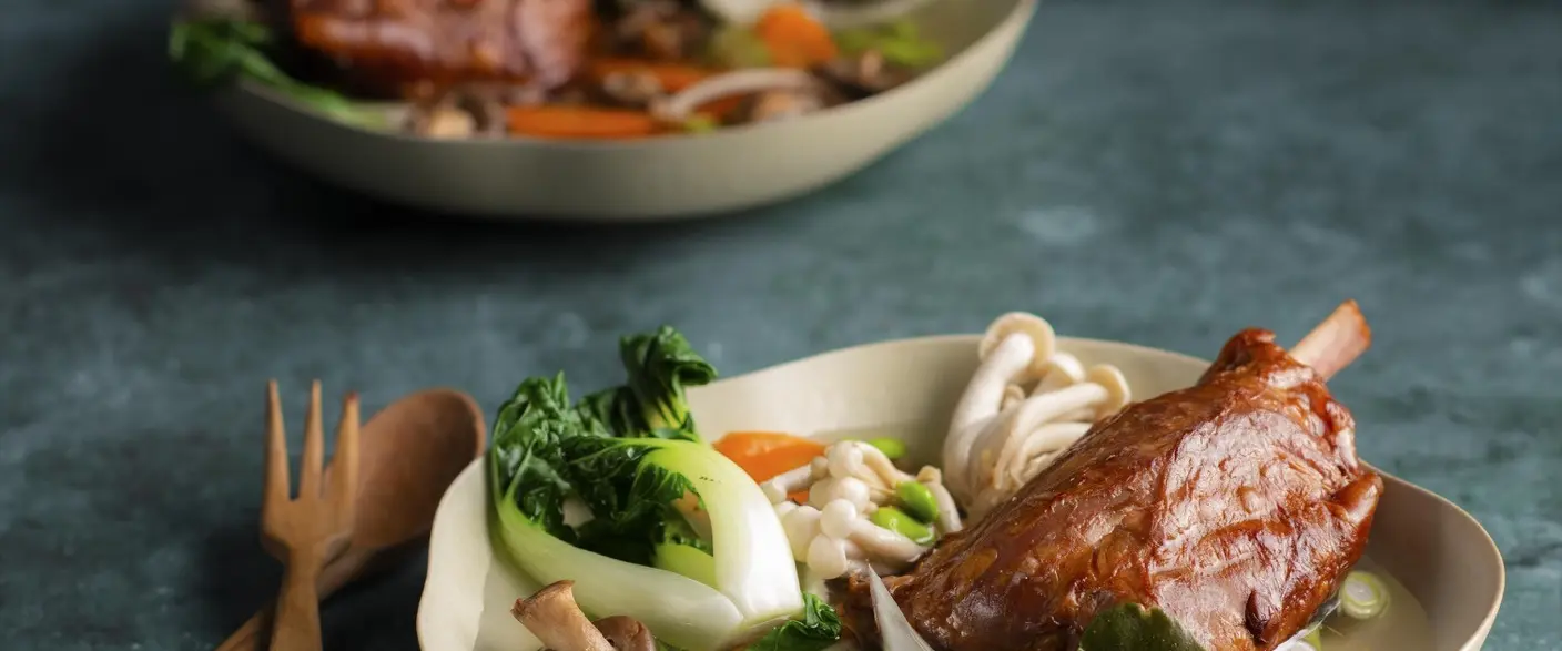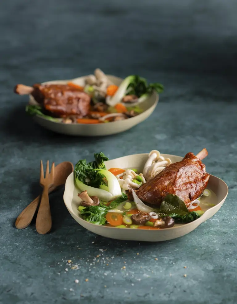 Bouillon met paksoi en mini jambonneau