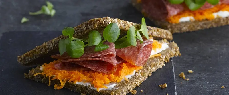 Bestrijk het roggebrood met de smeerkaas. Beleg met de geraspte wortel en enkele plakjes Salami Extra.