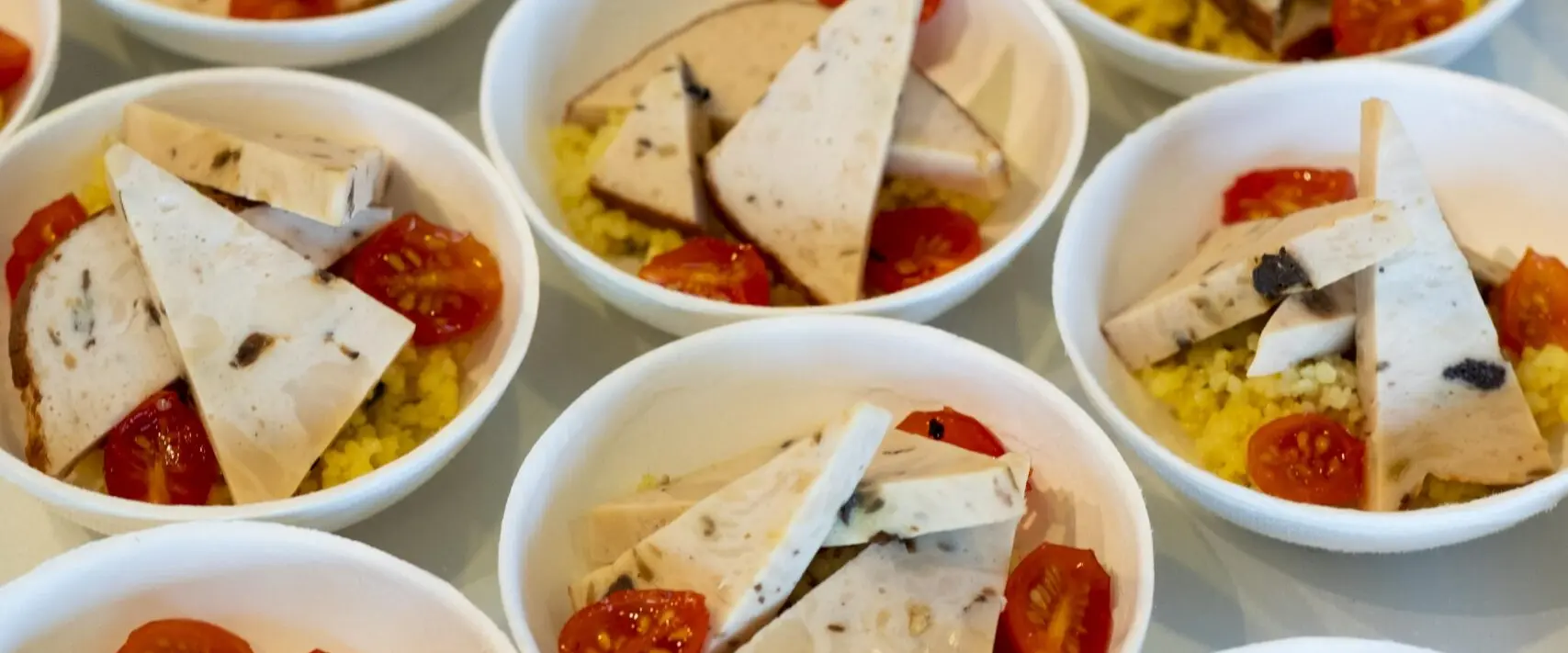 Schep een lepel couscoussalade in een bordje, dresseer er 3 stukjes kip bovenop en garneer met enkele tomaatjes en de verse peperselie.