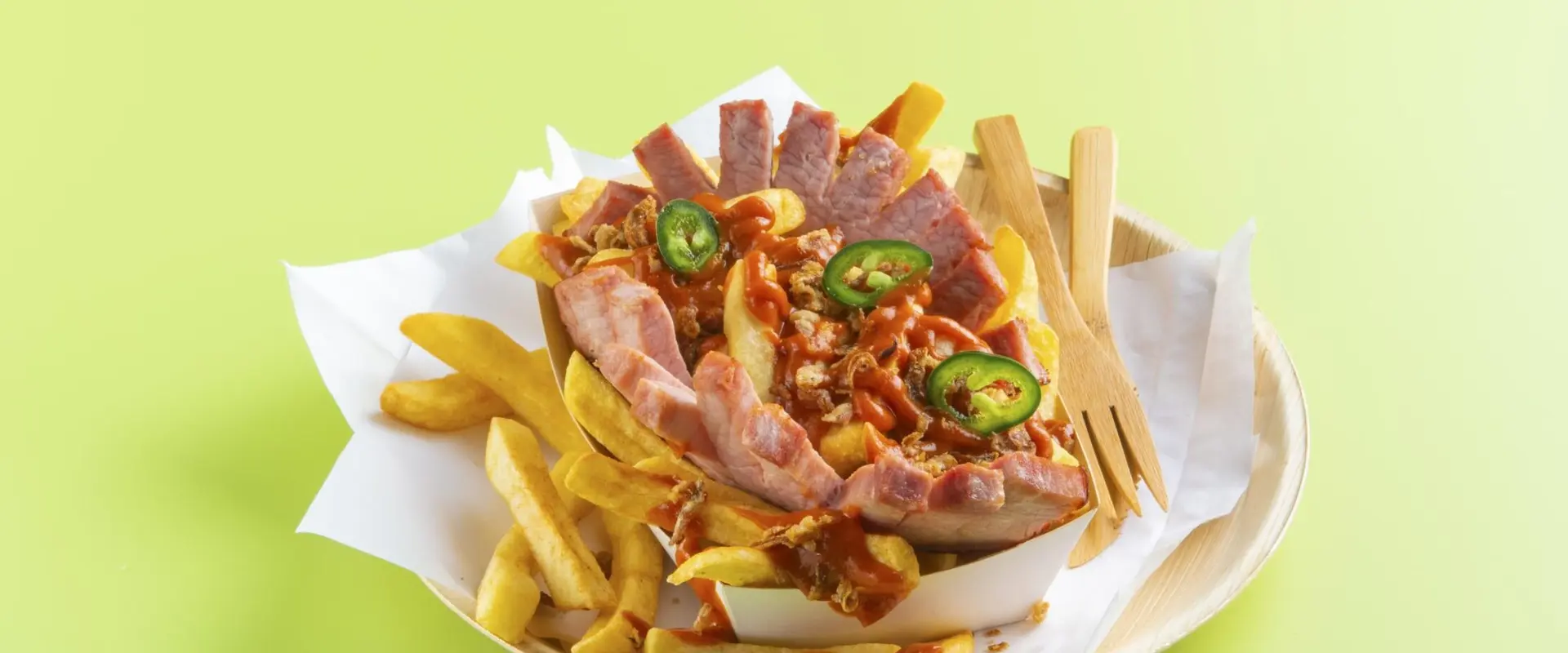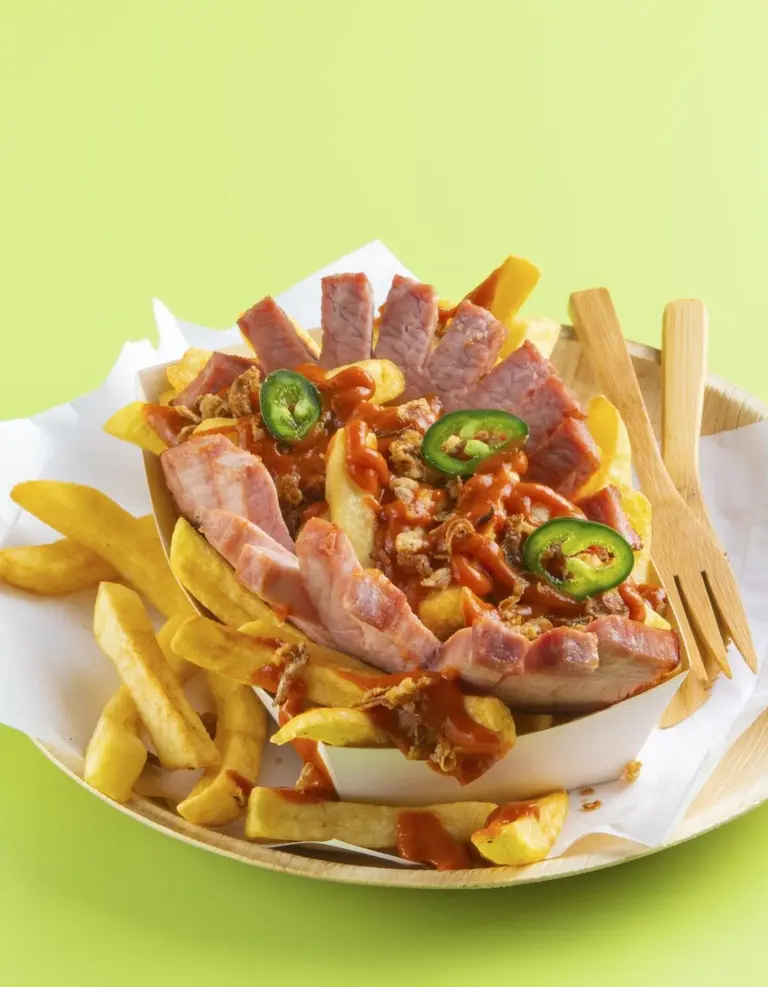 Friet “Imperialleke” met Minute Steak Ham aan het Spit