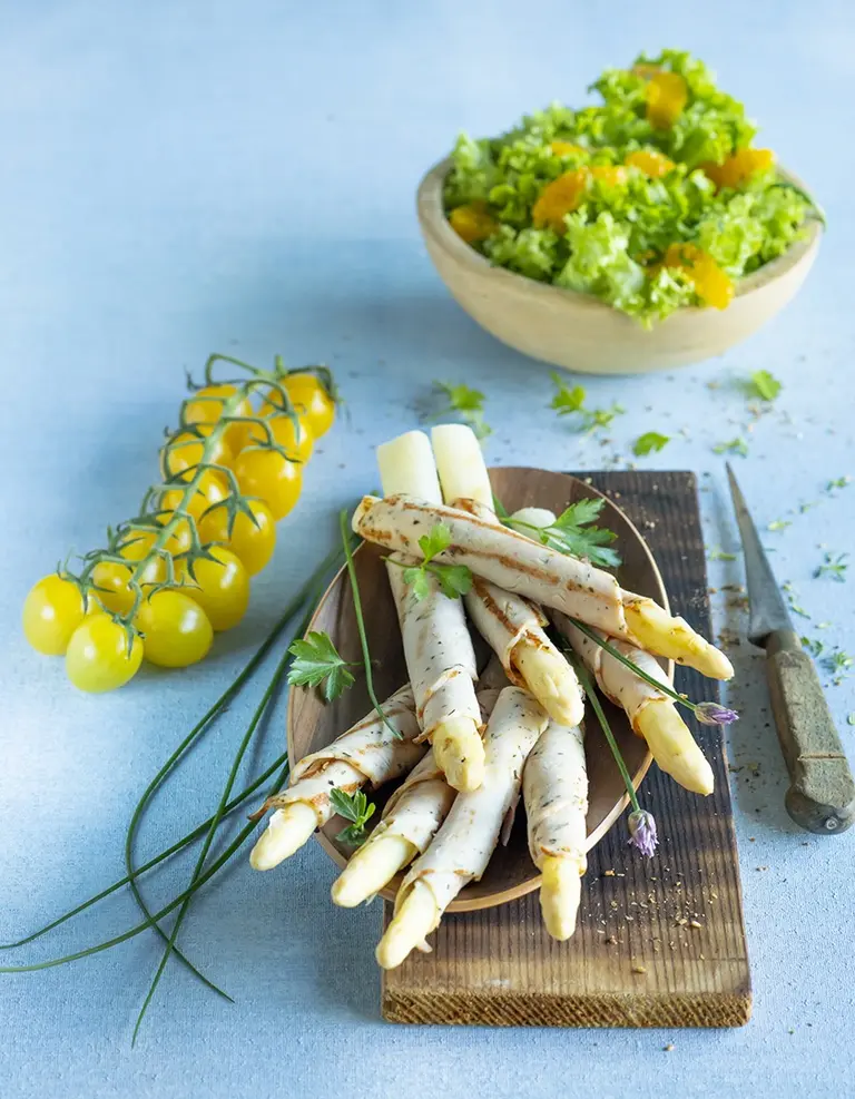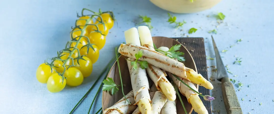 Laat afkoelen en wikkel elke asperge in een plakje Kippenroulade Tuinkruiden.