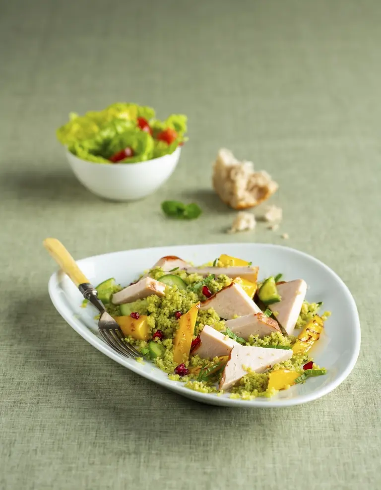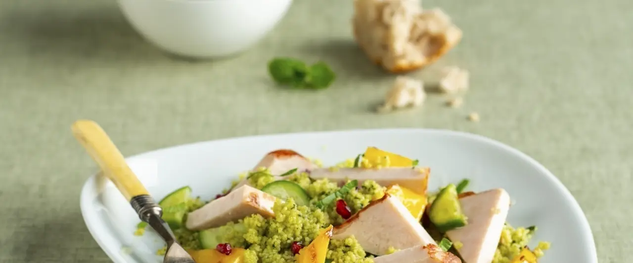 Dit heerlijke gerecht combineert de sappige gegrilde kip met lichte couscous, verfrissende komkommer en gegrilde mango. De toevoeging van granaatappel en munt zorgt voor een interessante en smaakvolle creatie.