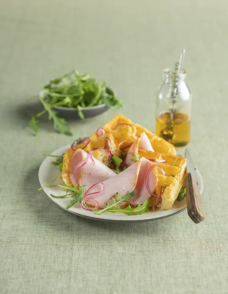 Dresseer het bord door de rucola stijlvol te schikken en de wafels in smakelijke stukjes te snijden.