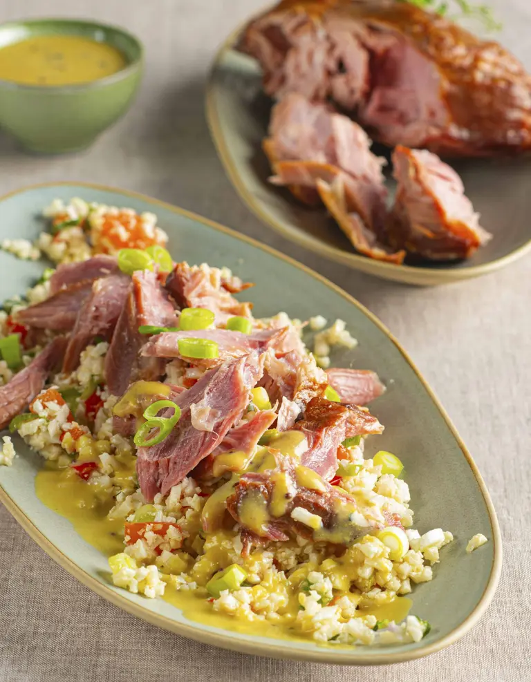 Combineer het rijke jambonneau met lichte bloemkoolcouscous voor een gezondere lunchoptie. Makkelijk te bereiden met slechts 7 ingrediënten. Ideaal voor gezondheidsgerichte klanten of het lunchassortiment.