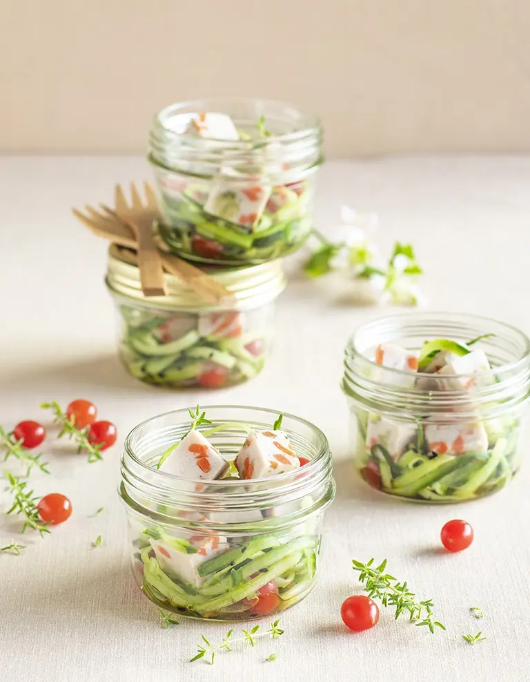 Verdeel de komkommer en de pareltomaatjes over de glaasjes.