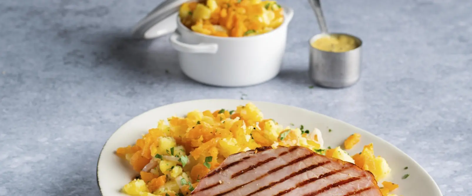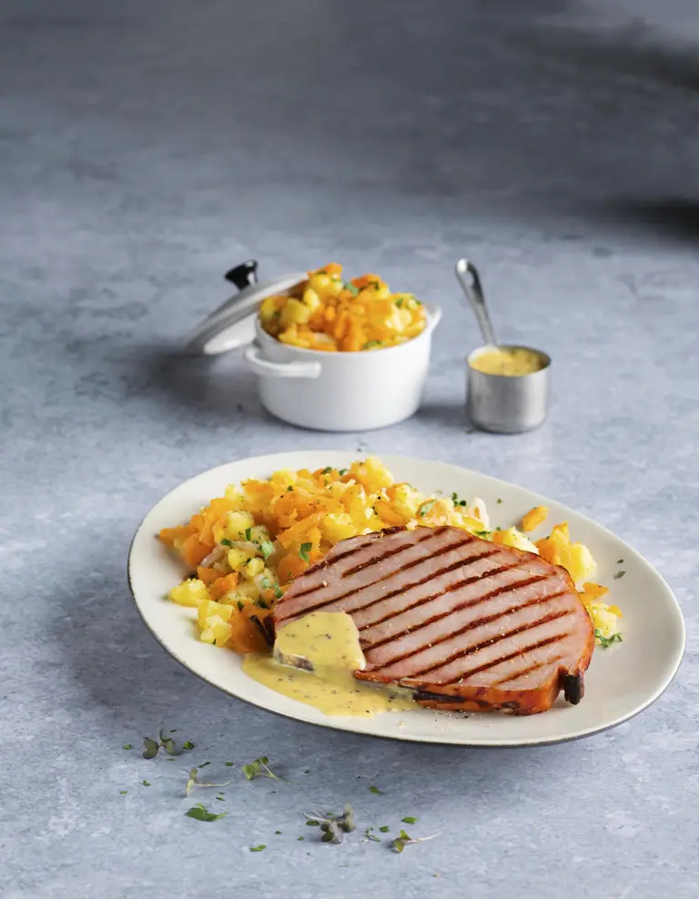 Minute Steak Ham aan 't spit gegrild met wortelstoemp en mosterdsaus