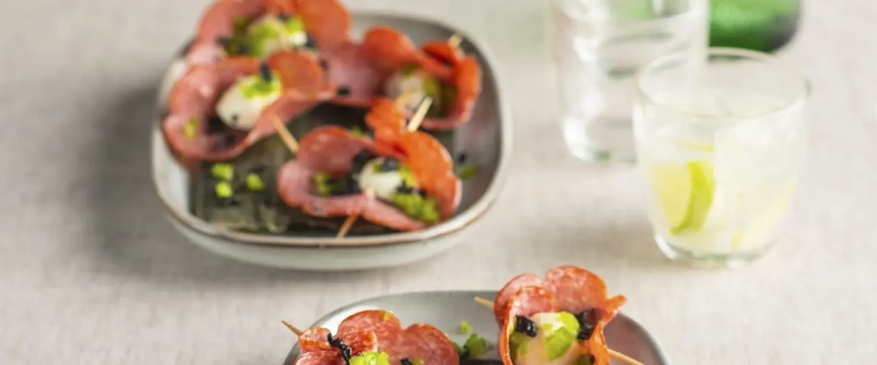 Een verfijnd hapje waarin frisheid en romigheid elkaar versterken. De zachte pepino en mozzarella krijgen pit van gemarineerde selder en een krokant accent van zwarte olijven. Ideaal als elegant aperitief voor klanten die verrast willen worden met iets anders.