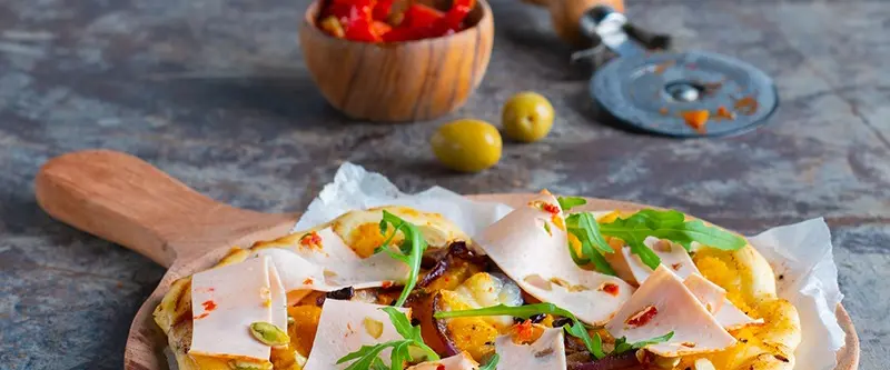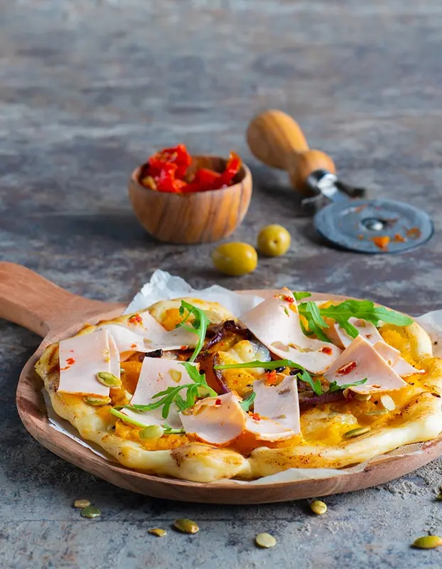 Kip met pompoenpizza, zongedroogde tomaat en olijf