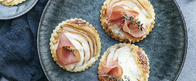 Deze taartjes brengen de zoetheid van peren samen met de romigheid van gorgonzola en de zoute ham van Aoste. Een smaakvolle combinatie, ideaal voor slager of traiteur die inzet op originele apero-ideeën.