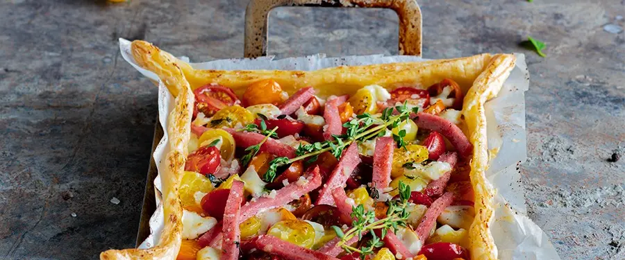 Deze hartige taart combineert zoet, romig en hartig in één hap. Perfect als warme meeneemoptie of voor buffetten in de foodservice.